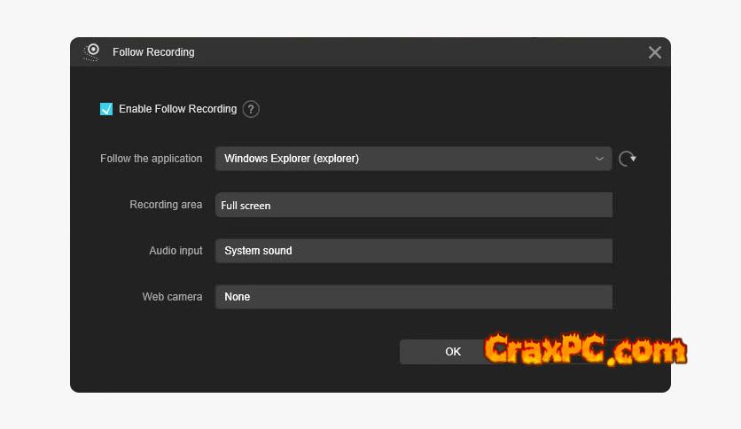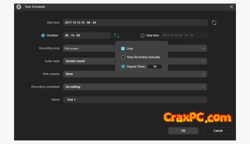 Make scheduled tasks to follow an application that is already running or to automatically record the PC screen or webcam.