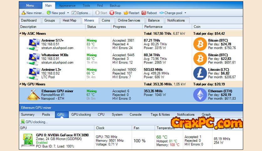 Awesome Miner is excellent for large-scale mining operations due to its capability of remotely monitoring and controlling multiple mining rigs.