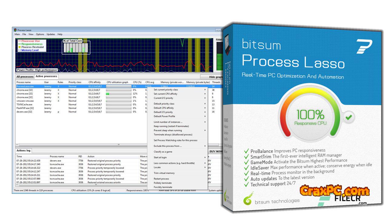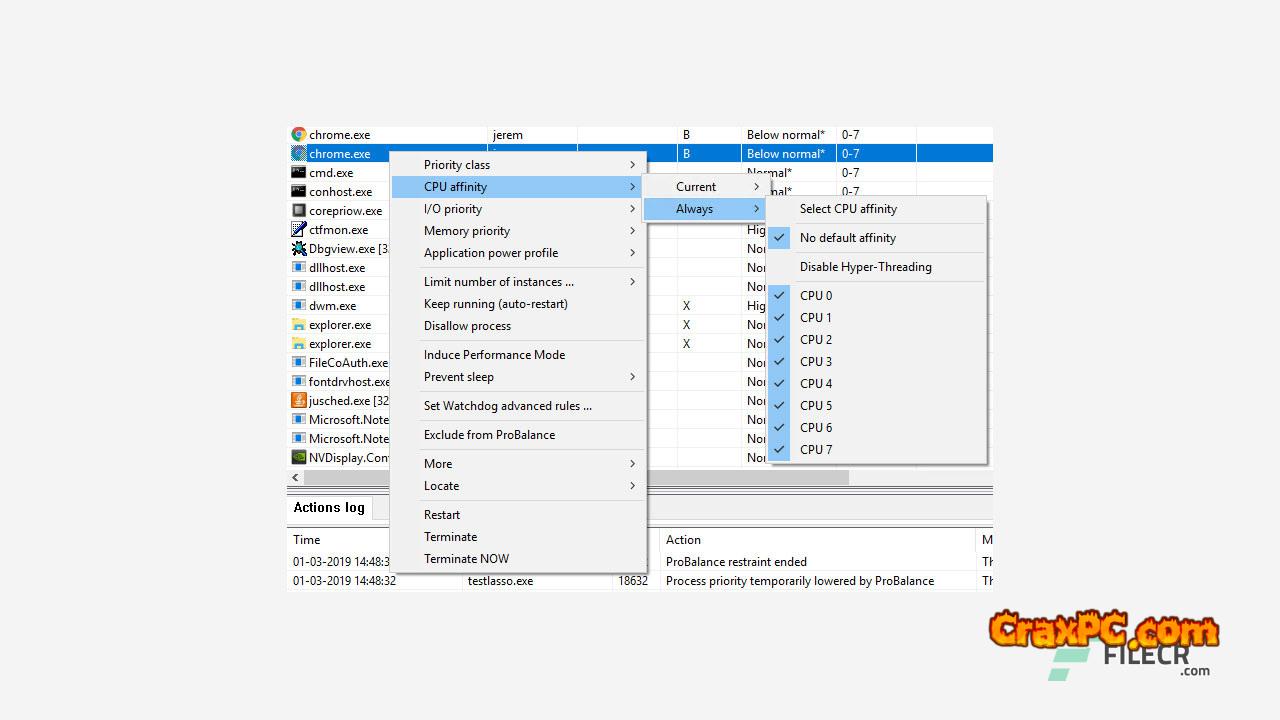 This program is provided with a variety of methods by Bitsum Process Lasso Pro to grant it total command over the allocation of CPU resources to active programs. Assign CPUs (cores) and determine which processes should run with priority. Additional options include logging all operating programs, disabling the execution of specific programs, and more (see list below).
