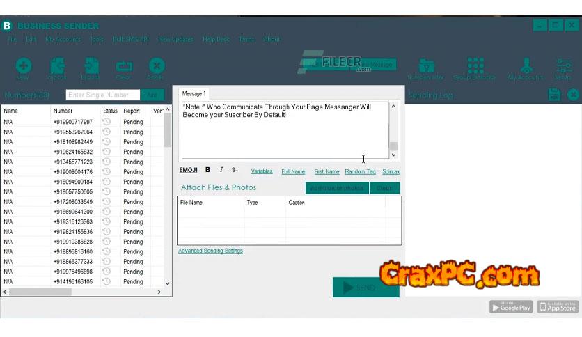 built-in filter for numbersExtractor for group contactscollective car posterseveral sending numbersSetup for advance sendingSleeping actively in between sendingGenerate Numbersdifferent types of messagesconcurrently send a document with images, videos, and audioRun many campaigns concurrentlyfunctions with any installed antivirus program