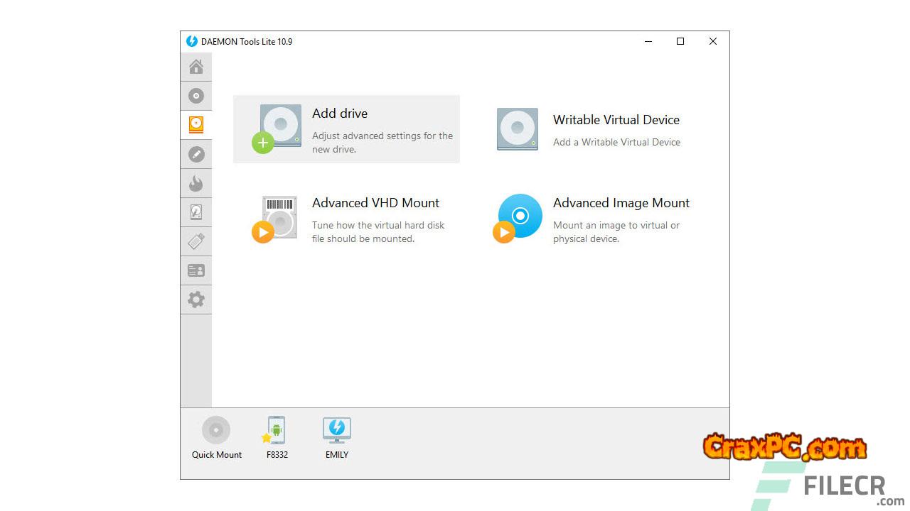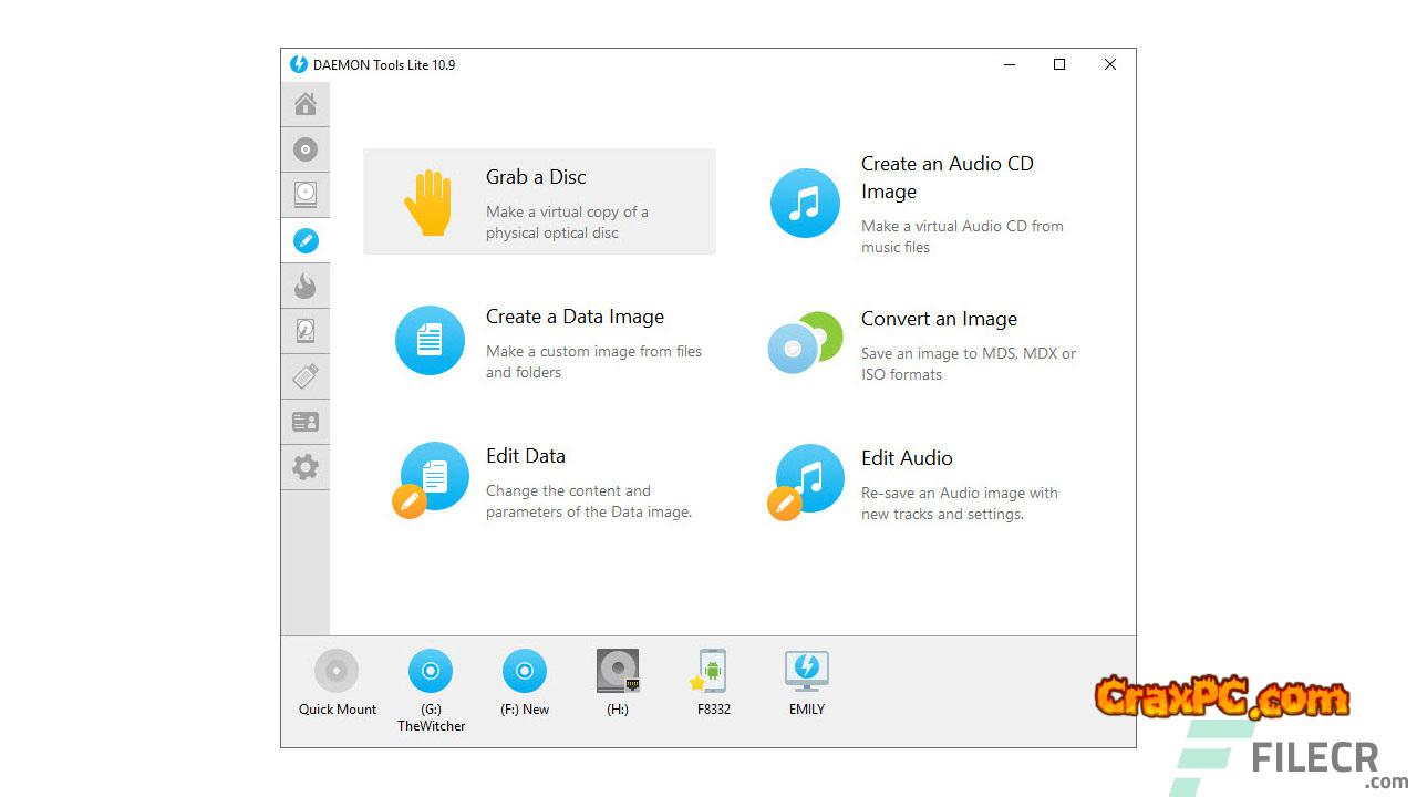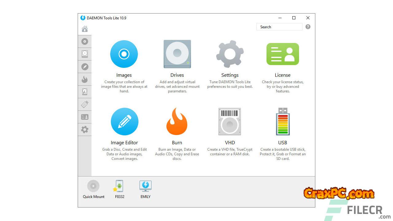 DAEMON Tools Lite emulates up to four DT + SCSI + HDD devices and permits the mounting of all known disc image files. It provides the capability to generate images of optical discs and retrieve them through a structured catalog.