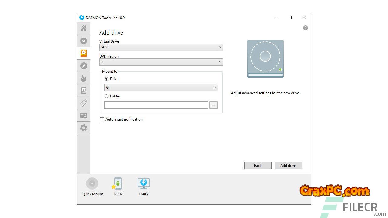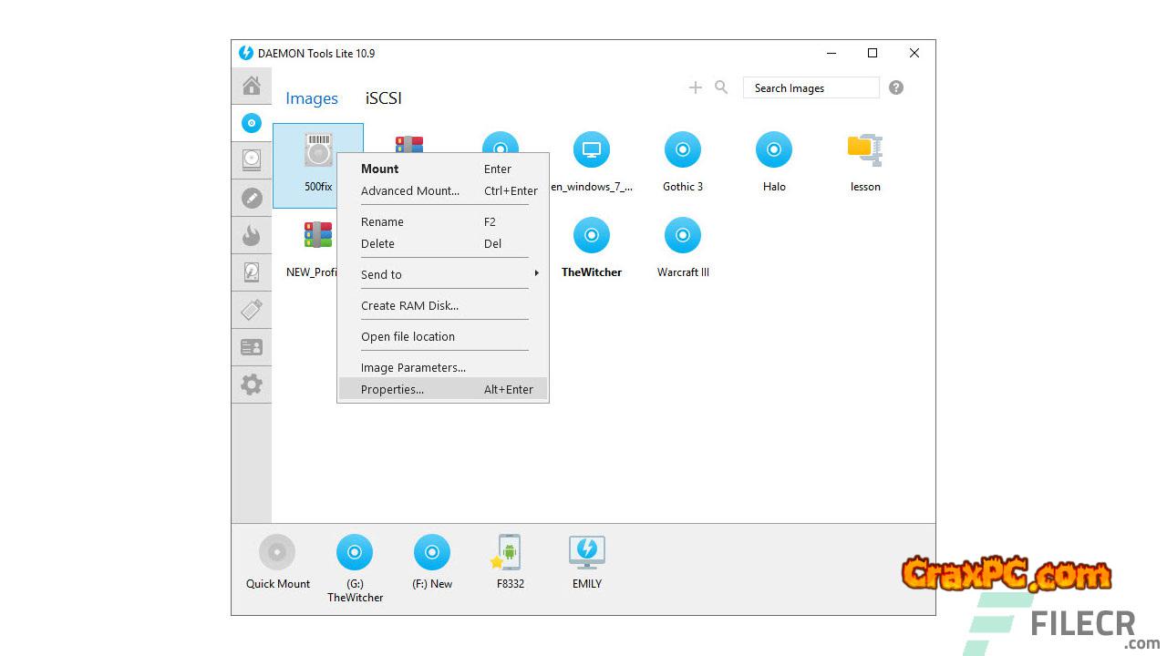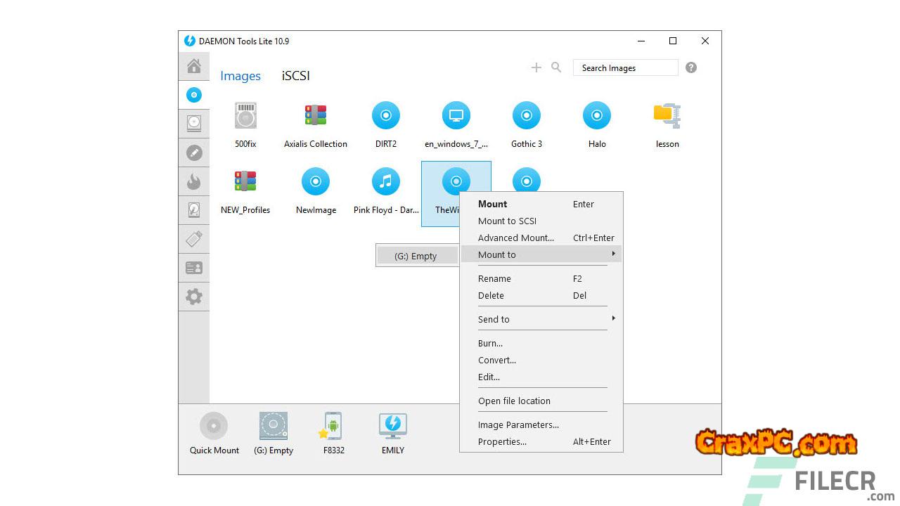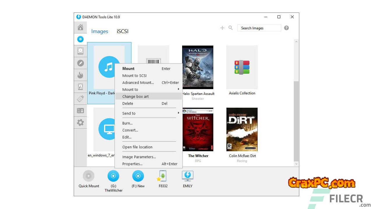 DAEMON Tools Lite emulates up to four DT + SCSI + HDD devices and permits the mounting of all known disc image files. It provides the capability to generate images of optical discs and retrieve them through a structured catalog.