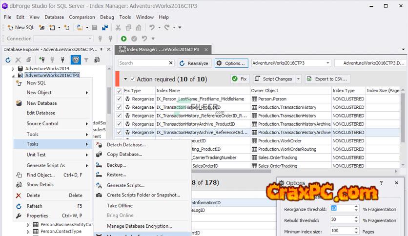 A practical application for examining the state of SQL indexes and resolving issues related to index fragmentation. Index Manager enables the rapid collection of statistics regarding index fragmentation and the identification of databases in need of maintenance. Visual mode allows you to immediately restructure and reconstruct SQL indexes, as well as generate SQL scripts for future use.
