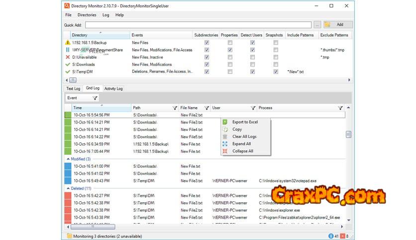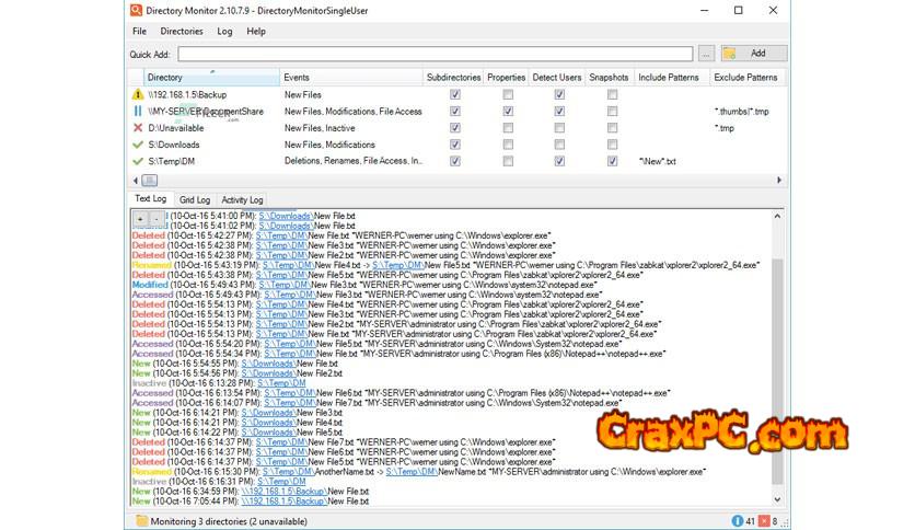 Changes made by users and processes can also be identified. Directory Monitor offers additional functionalities, including text logs, automation through script/application execution, emailing, database writing, and aural notifications, through the utilization of plugins.