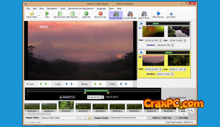 You have the option to designate particular segments of the video to play or not play. Additionally, it is simple to divide the videos into segments of the same length or by duration. It is also possible to apply a fade-in and fade-out effect to the entire video clip or just to individual clips.