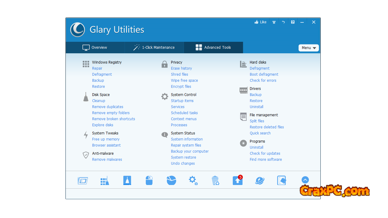 In addition, Glary Utilities 5 provides the capability to perform tasks such as managing programs that launch at Windows startup, optimizing memory, locating, repairing, or removing damaged Windows shortcuts, and uninstalling software. Additionally, a secure file deletion option and an Empty Folder finder are provided. Additionally, a secure file deletion option and an Empty Folder finder are provided. All Glary utility tools are accessible via an aesthetically appealing and uncomplicated interface.