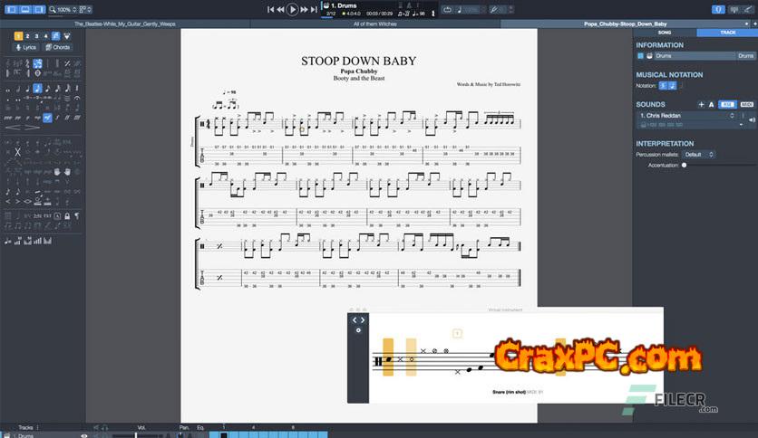All recordings, including piano, voice, and drums, have standard notation automatically transposed into tablature, in addition to fretted instruments like guitars. Connect your instrument to an external sound card that is also connected to instrument Pro. Utilize the preset effects for a specific track within a provided file.