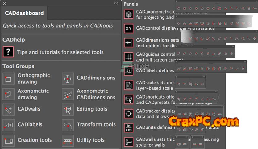 92 additional tools are added to the tool interface by CADtools. The quantity and positioning of mouse touches required to modify or generate an object, label, or dimension are denoted by red dots. Scale Line, Repeat, Repeat Along Path, Scaled Type, Grid, and Wave are examples of contemporary instruments.
