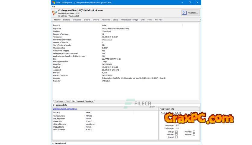 The foundation of this application is the MiTeC Portable Executable Reader. It extracts and displays the structure and properties of executable files. VxD (Windows 9x Virtual Device Driver), PE32 (Portable Executable), PE32+ (64bit), and NE (Windows 3.x New Executable) file extensions are supported. Furthermore,.NET executables are supported.