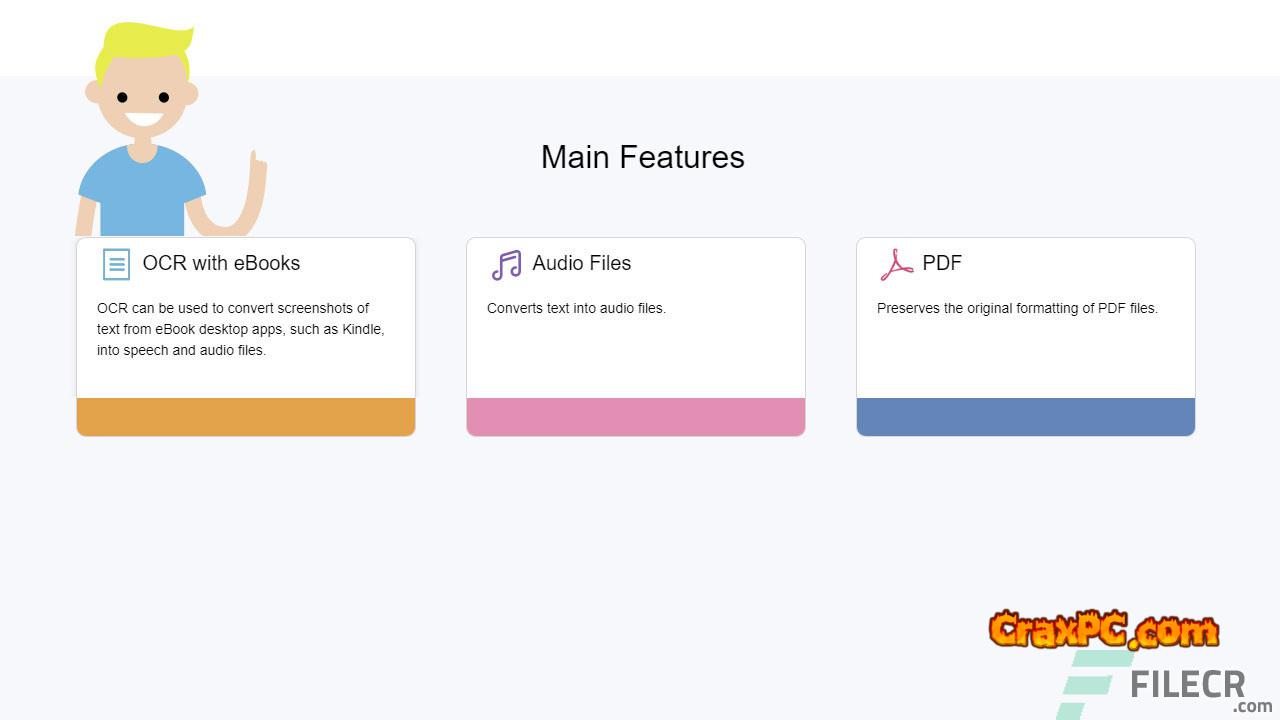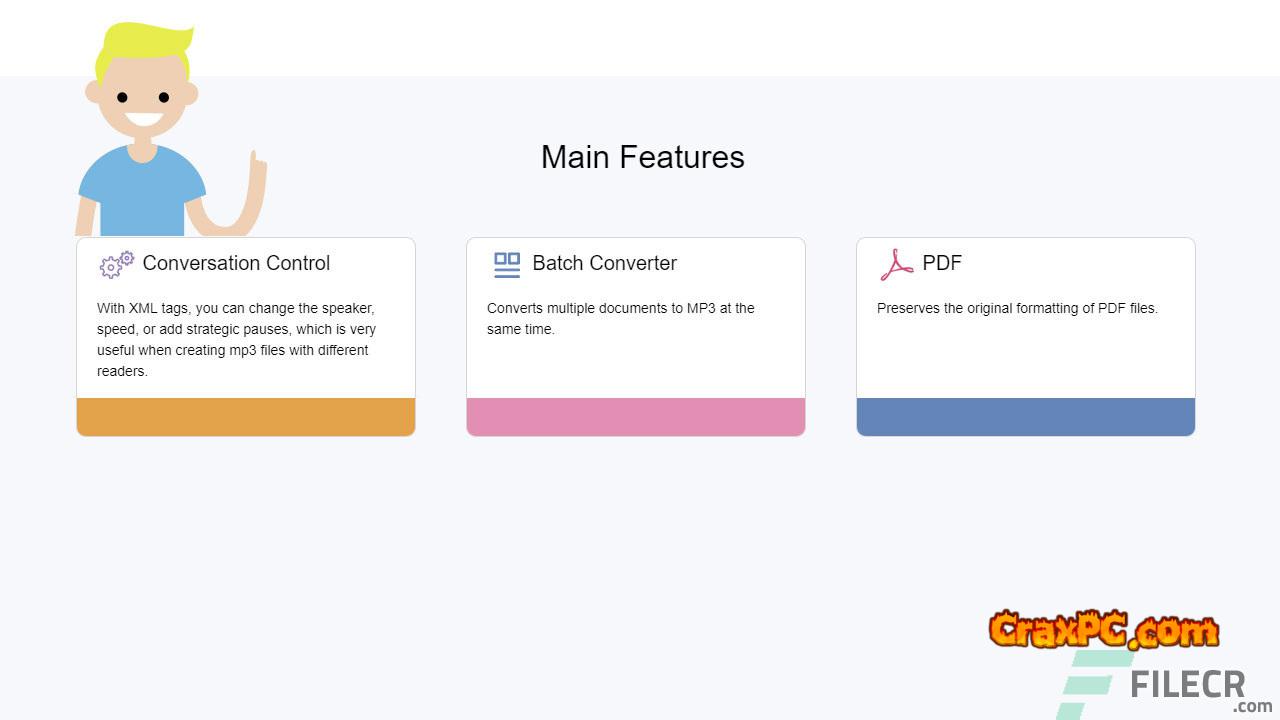 Turn any text or document into voiceovers that sound natural.accepts text, PDF, and Docx documents.Digital text can be created from printed characters using the OCR tool.OCR can be used to translate text screenshots from eBook desktop applications.transforms text into audio recordings.maintains PDF files’ original formatting.Directly listen to webpages.provides a straightforward method for reading text right off the page.It is possible to change a word’s pronunciation by hand.You can create deliberate pauses, adjust the speaker, and adjust the pace using XML tags.simultaneously converts several documents to MP3 format.
