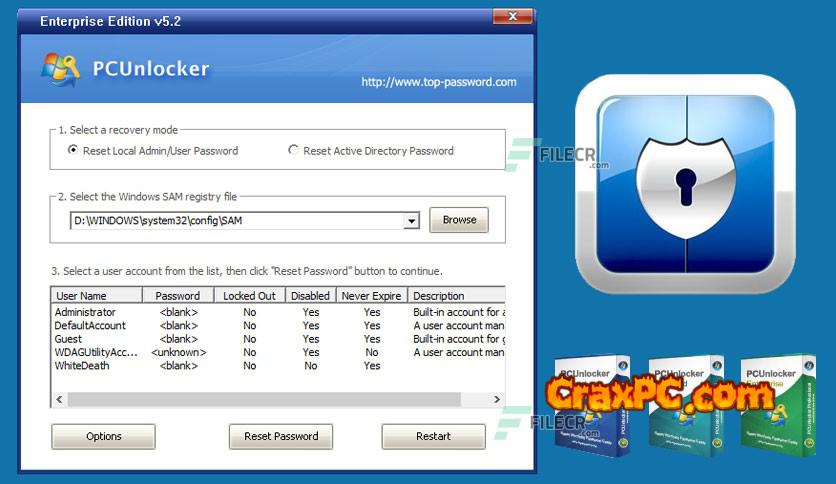 Get PCUnlocker Enterprise for free to help you quickly reset your Windows domain administrator, local administrator, and other user account passwords if you’ve forgotten them. Get back into your locked computer without having to do an OS reinstall. 100% assurance of recovery rate.