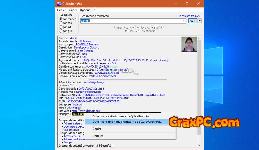 This tool is specifically engineered to efficiently retrieve information, including details pertaining to registered accounts, group memberships, and users. QuickUserInfos is simple to employ; simply choose the desired search type (e.g., by account or name) and input the occurrence to be located.