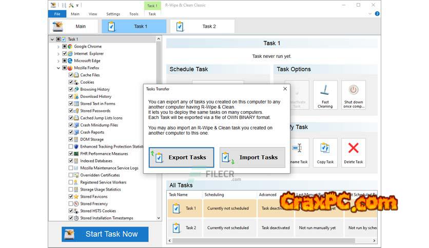 It is also possible to create lists of specific traces that need to be cleaned for unsupported programs. able to merge all minor file deletion and computer cleaning operations into major tasks that can begin instantly or at predetermined times or occurrences.