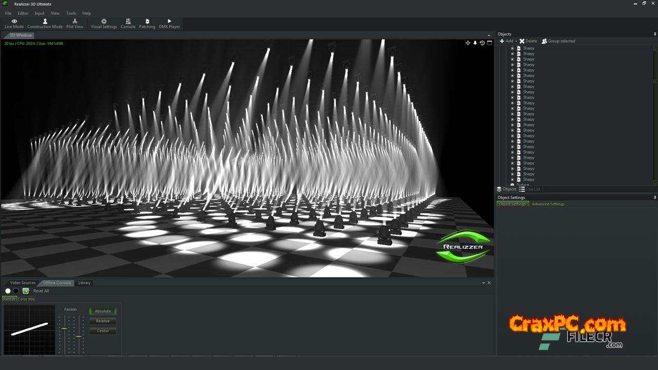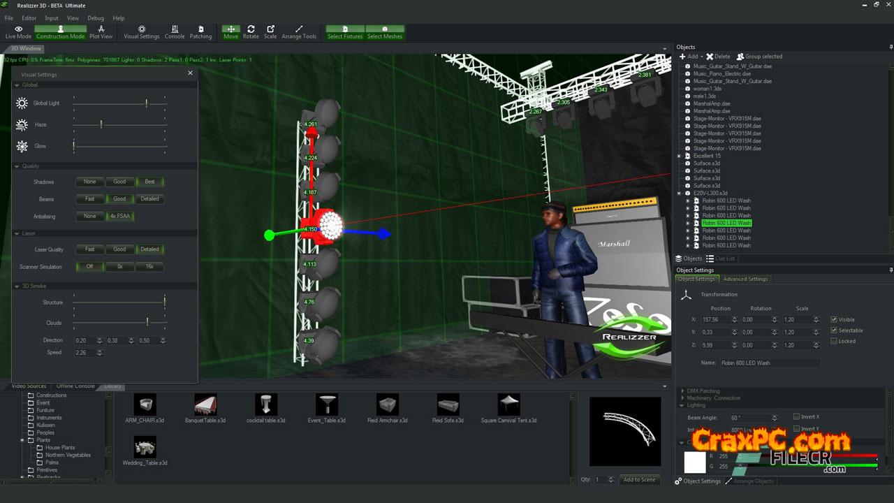 Realizzer 3D Studio full version download for Windows With it, you can make incredibly lifelike designs and see your light show instantaneously on your computer in real time. The program includes a large library with numerous 3D models, including stages, decorations, and beams, among other items.