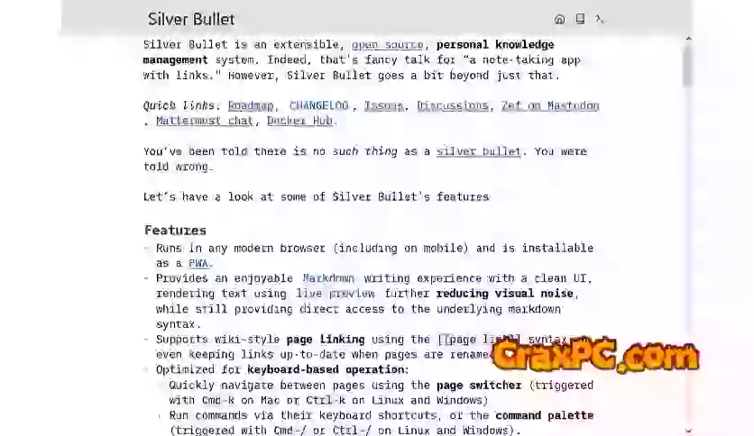 Download SilverBullet for Windows for free. It is an application for taking notes that has been designed with a programmer mentality in mind.