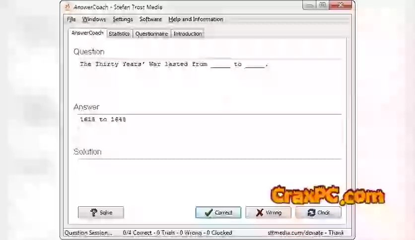 Download AnswerCoach by Stefan Trost for Windows for free. It is an exceptional application specifically developed to optimize your educational experience on your personal computer. It assists users in test or examination preparation by displaying queries at random from a predetermined list.