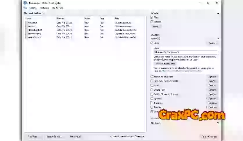 With the program, you may use masks to create new file names dynamically. These masks generate personalized file names by combining text elements and placeholders. You could, for instance, make a mask that appends to each file name the file number and the total number of files enclosed in brackets.