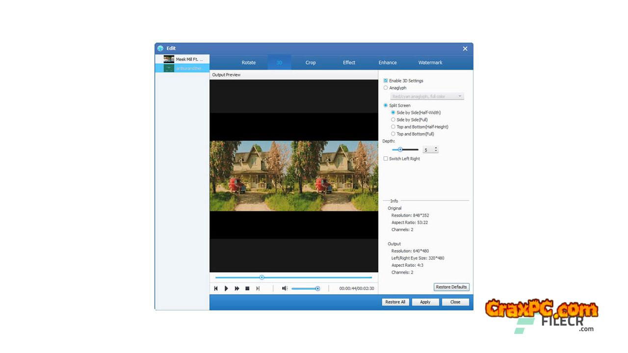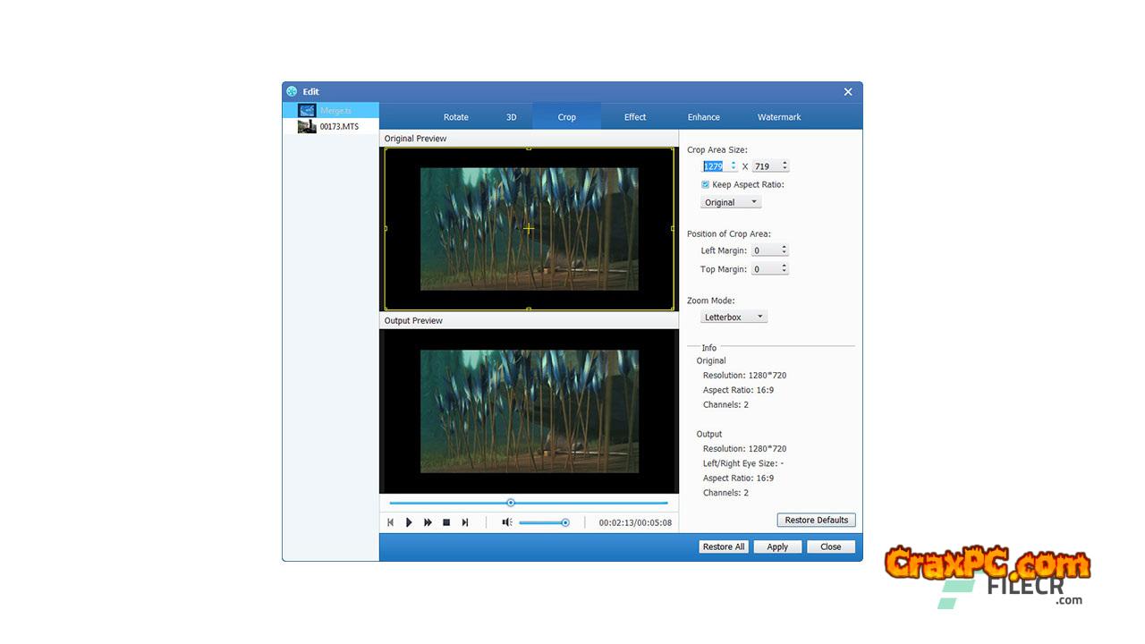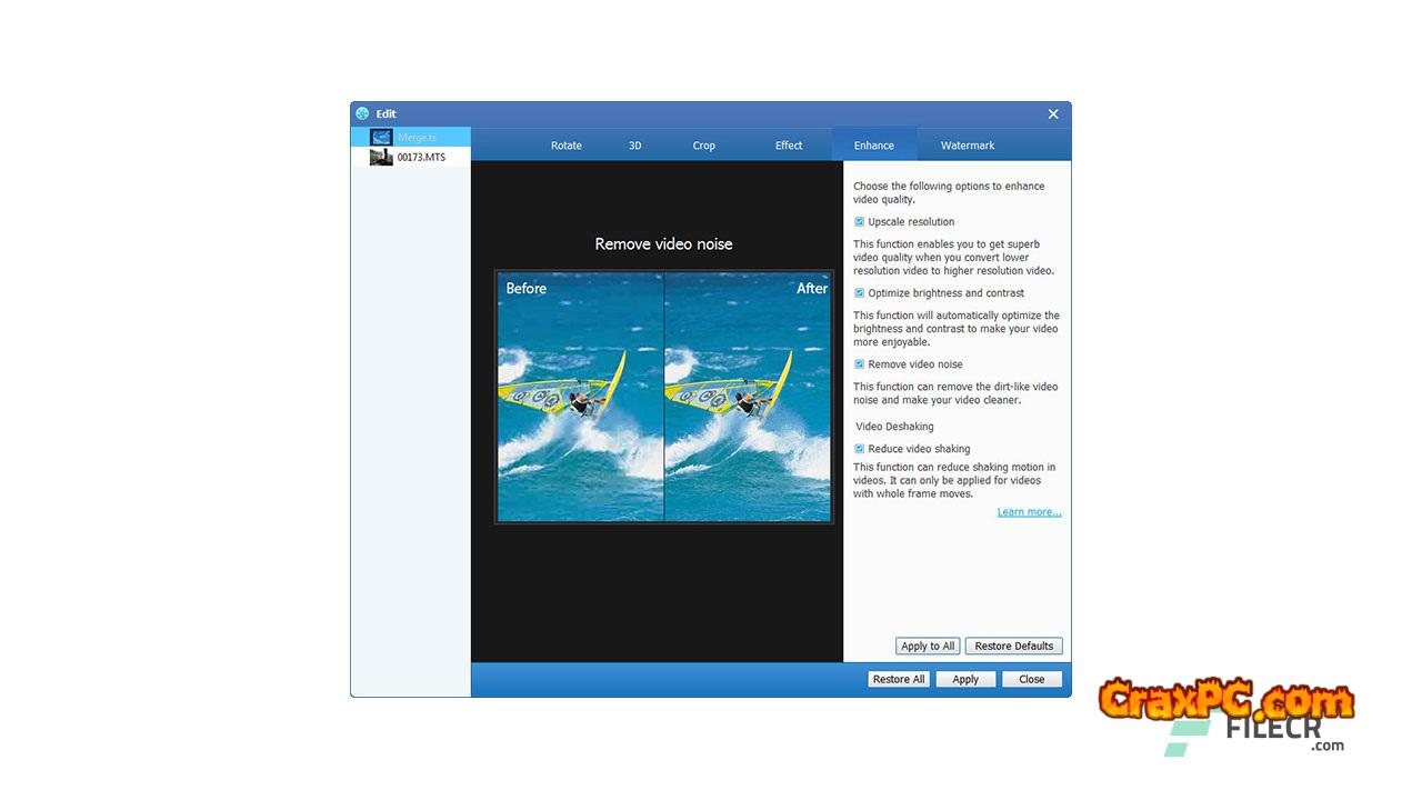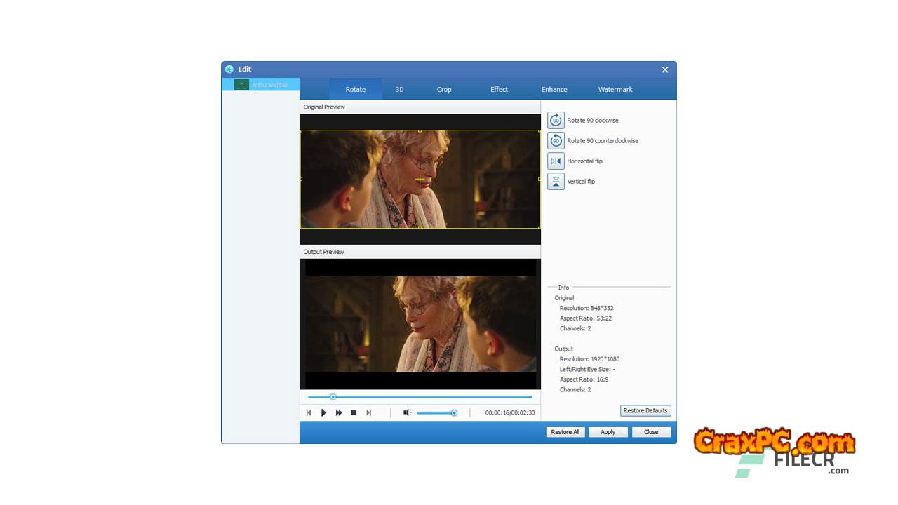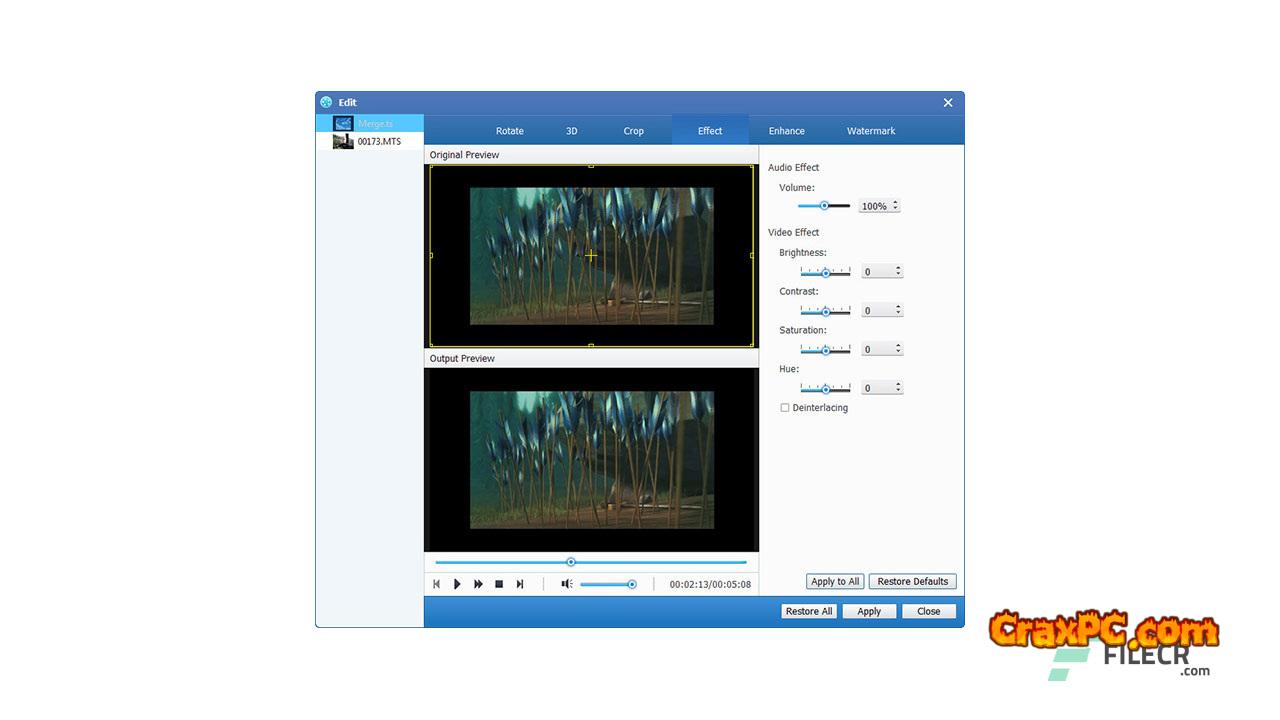 The integrated video editor of this media conversion tool enables users to trim and merge their preferred video segments, eliminate black bars, add text or image watermarks, and customize the brightness, contrast, saturation, hue, and volume of the output video to their specifications.