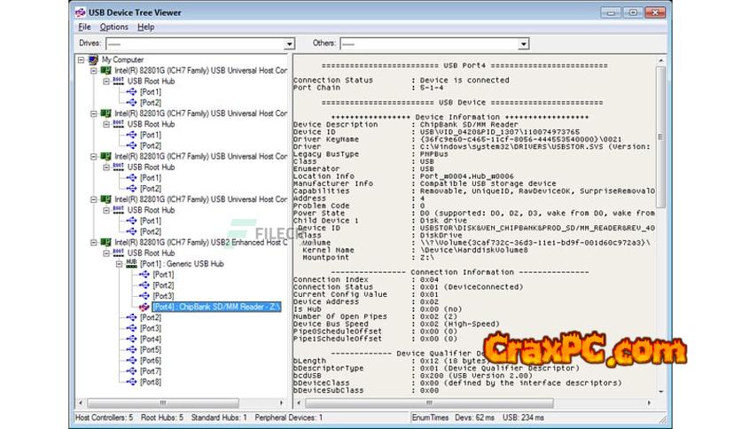 USB Device Tree Viewer latest version standalone offline installer for Windows is available for free download. It facilitates rapid data retrieval from the USB host controllers.