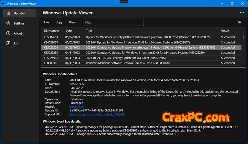 Download for free the most recent standalone offline installer for Windows Update Viewer. It presents details pertaining to Windows Updates.