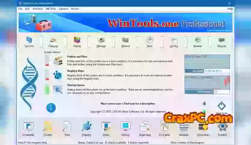 Windows users can download WinTools.one Professional for free. The primary objective of this software is to optimize the functionality of the Microsoft Windows operating system. This is achieved through error correction, disk space optimization, and program management. Furthermore, it empowers users to effortlessly operate with virtual disks and facilitates the storage and protection of sensitive data.